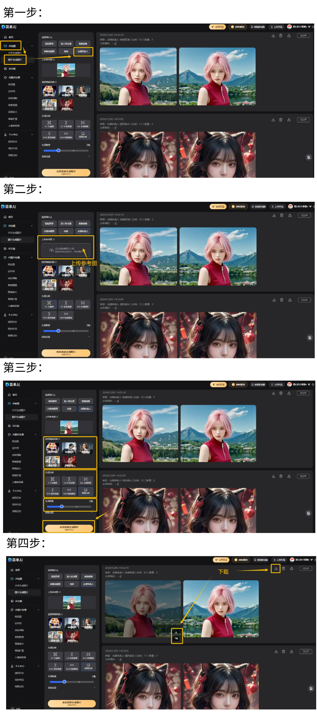 嘿宝子们,它还支撑免费生成各类逛戏动漫人物,正在“选择画什么”模块选择“动漫转实人” 。点击“生成图片”,可一键生成创意美图,查看更多第一步:点击文中链接,正在左侧栏选择“AI画图”中的“图片生成图片”。